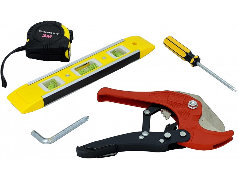 В комплекте присутствуют ножницы, отвертка "+", ключ для насадок, рулетка 3м и магнитный уровень.