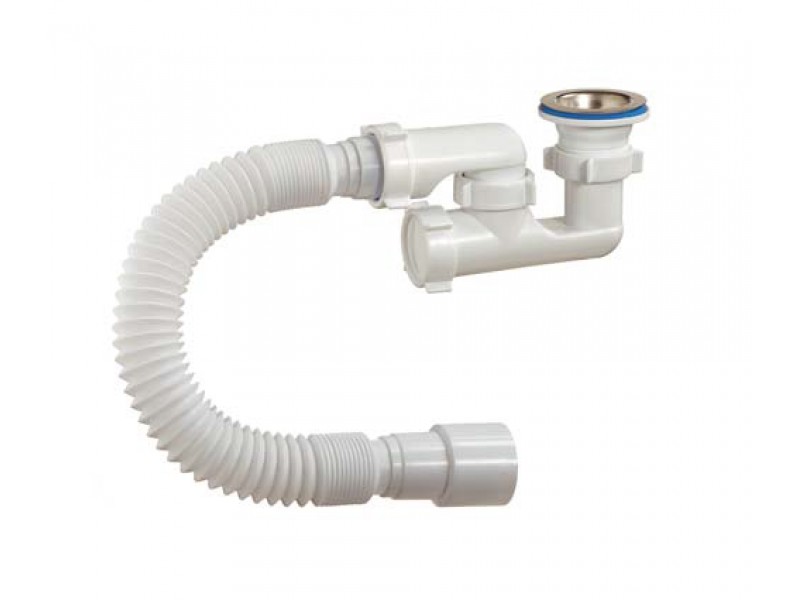 Сифон регулируемый с выпуском клик-клак и гибкой трубой для душевого поддона из полипропилена белого цвета.