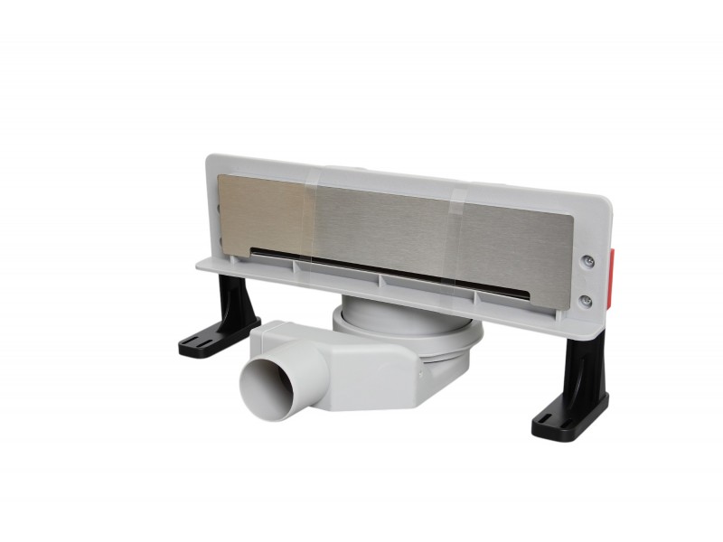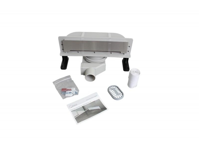 Трап для душа для монтажа в стену из пластика с решеткой из нержавейки, гидрозатвором, поворотным горизонтальным сифоном.