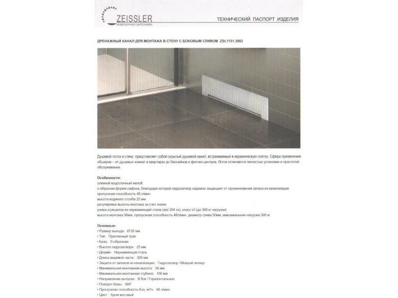 Душевой лоток для монтажа в стену 300мм ZEISSLER ZSt.1151.3002