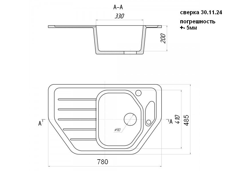 На мойках установка которых возможна чашей, как слева так и справа ,отверстие под смеситель ВЫСВЕРЛИВАЕТСЯ ФРЕЗОЙ!