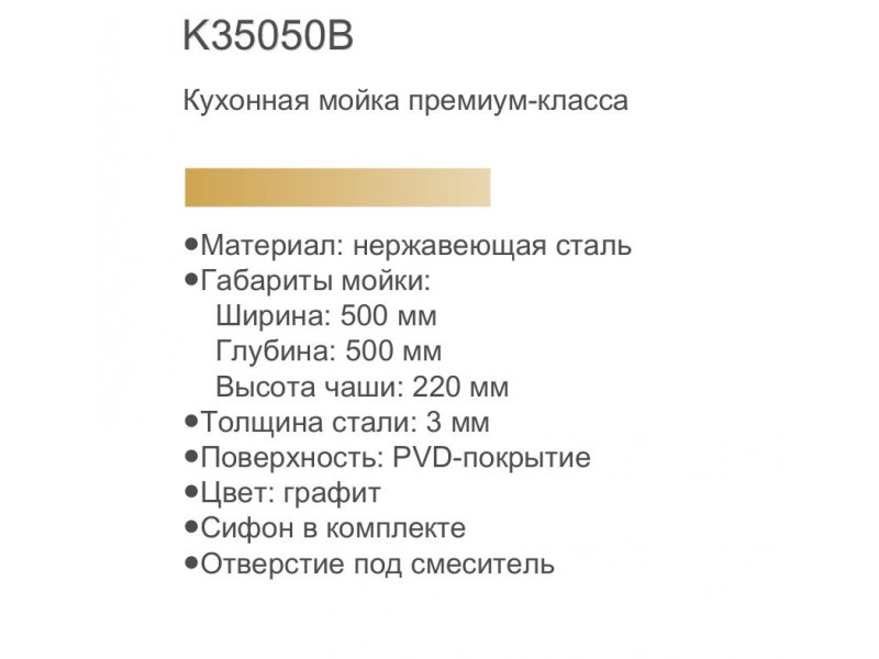 W35050B+сифон W02+дозатор WW405B, Кухонная мойка ГРАФИТ премиум WISENT 500*500Комплектуются сифонами с выпуском Ø110.В нашей компании можно приобрести товар для оптовой торговли. Розничные и мелкооптовые клиенты обслуживаются в сети дилеров ООО Аш Два О или в магази.. |