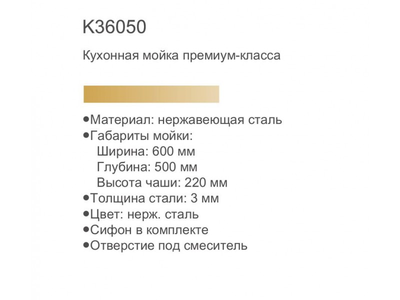 WS-36050 Кухонная мойка WISENT БЕЗ СИФОНА нержавейка, сатин 600*500Кухонная мойка WISENT WS-36050Модель: WS-36050 WISENT;Дата выхода на рынок: 03.2024;Материал: нержавеющая сталь SUS304 толщиной от 1 до 3 мм;Цвет/поверхность: сатин.. |