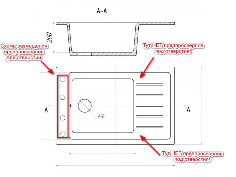 Внимание! Нестандартное размещение предпросверлов под отверстия для смесителя! Предпросверлы не в центре мойки, а с краю! Смотрите схему, рисунок! Учитывайте этот нюанс!