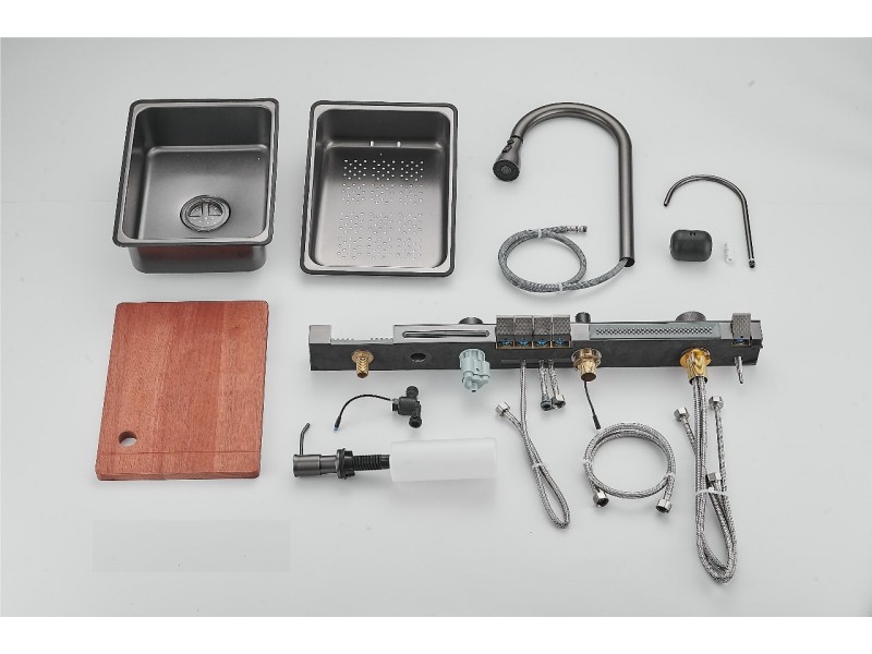 K37545BD Gerhans комплект для кухниКомплект поставляется в единой упаковке. Мойка изготовлена из стали с микродекором и покрытием графитного цвета.Набор содержит пару коландеров и разделочную доску.Дополнительно мойка укомплектована ри.. |