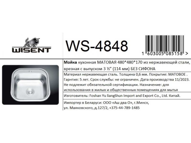 Кухонная мойка из нержавеющей стали WISENT WS-4848