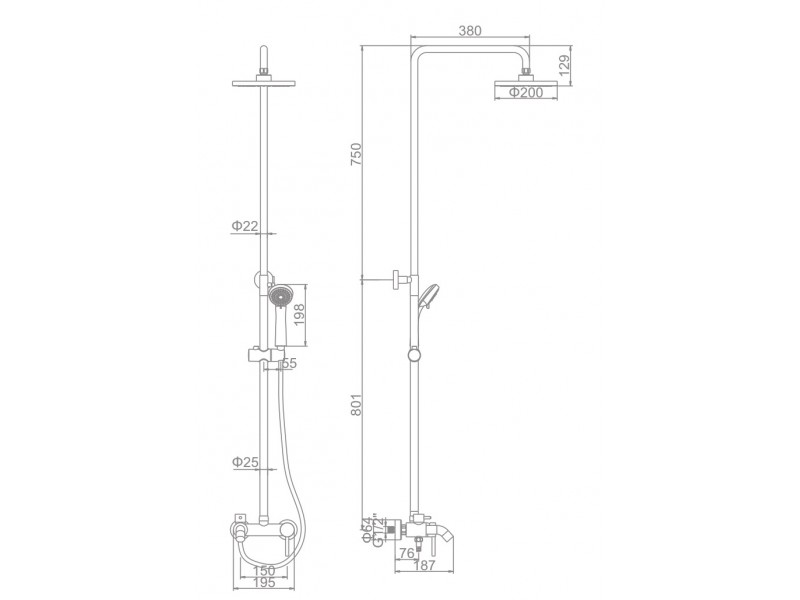 В комплект системы входит смеситель, стойка душа с потолочной лейкой, ручная лейка со шлангом и монтажный комплект.