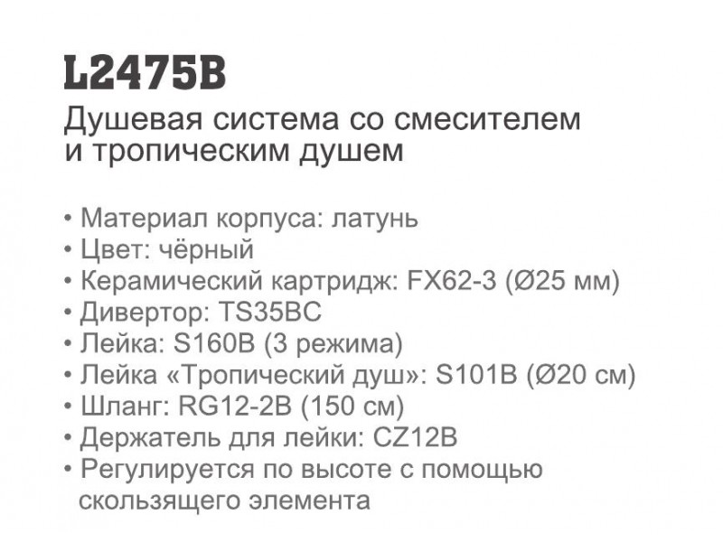 L2475 Душевая система со смесителем и тропическим душемВ нашей компании можно приобрести товар для оптовой торговли. Розничные и мелкооптовые клиенты обслуживаются в сети дилеров ООО Аш Два О или в магазинах торговых представителей Производитель: ZHEJIANG.. |