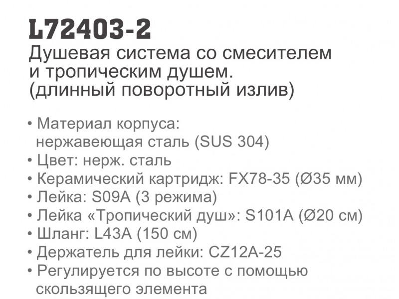 WP735-003-2 WISENT Душевая система с смесителем и тропическим душемДушевая система WISENT WP735-003-2Модель: WP735-003-2 WISENT;Дата выхода на рынок: 04.2024; Материал корпуса: металл, нерж. сталь;Цвет: сатин, нерж. сталь;Размеры: см. схему;.. |