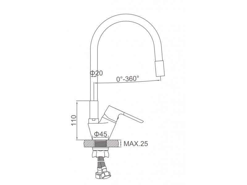 Комплект смесителя включает гибкую подводку в стальной оплетке с внутренней трубкой из экологичного этиленпропиленового полиэтилена PEX.