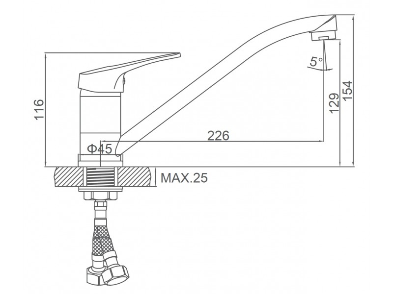 Комплект смесителя включает гибкую подводку в стальной оплетке с внутренней трубкой из экологичного этиленпропиленового полиэтилена PEX.