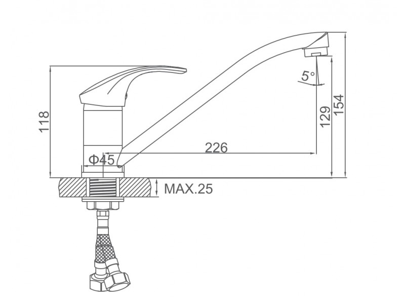 Комплект смесителя включает гибкую подводку в стальной оплетке с внутренней трубкой из экологичного этиленпропиленового полиэтилена PEX.