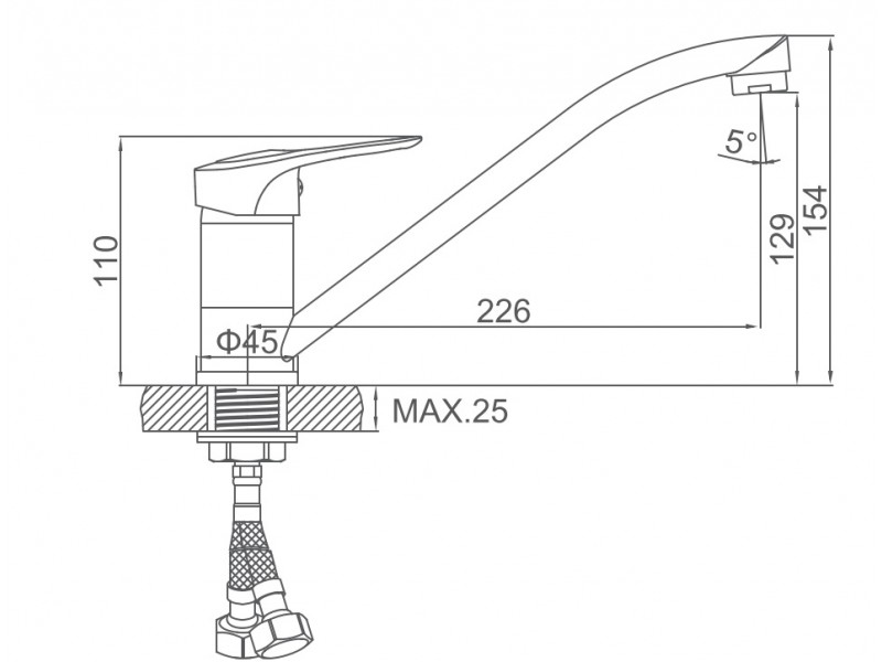 Комплект смесителя включает гибкую подводку в стальной оплетке с внутренней трубкой из экологичного этиленпропиленового полиэтилена PEX.