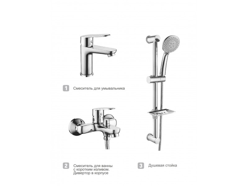 Набор смесителей Wisent W0014Комплект смесителей для ванной комнаты с умывальником.Набор включает смеситель для умывальника W1047 и для ванны с душем W2247.Также в комплект входит стойка для душа W9042 с держателем лейки.В .. |