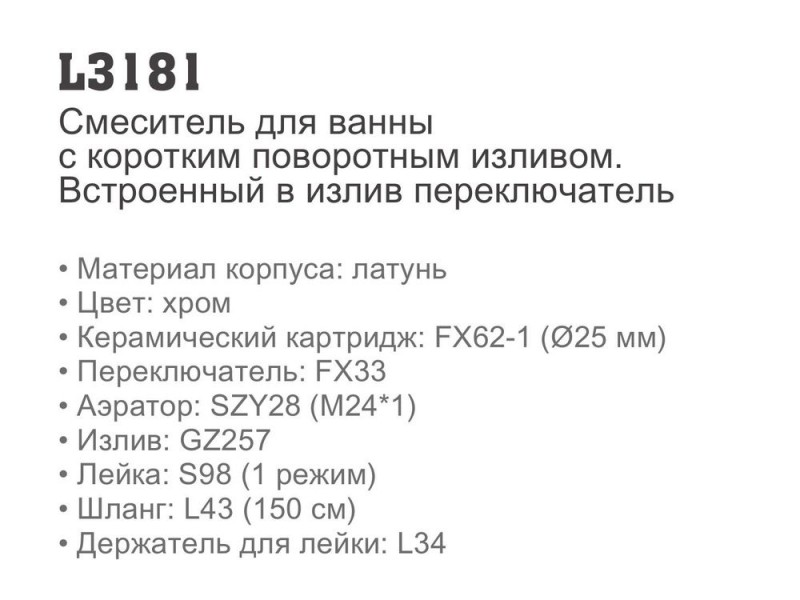 L3161Смеситель для ваннойСмеситель для ванной однорычажный Ledeme L3161 Модель: L3161 Ledeme;Материал корпуса: латунь;Цвет: хром;Запорный механизм: картридж керамический, D35 мм;Тип крепления: на стену;Ком.. |