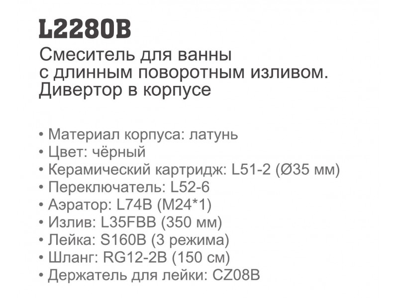 L2261B Смеситель для ванной, черный ,LEDEMEСерия H61B латунь Ø35 Новинки Смеситель для ванной однорычажный Ledeme L2261B ;Модель: L2261B Ledeme ;Дата выхода на рынок: 12.2023;Материал корпус.. |