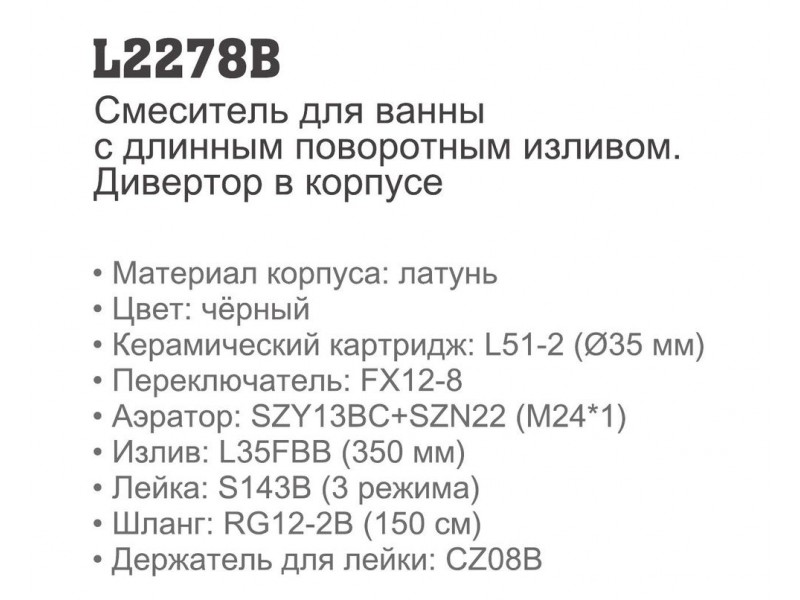 Модель для ванной с цельнолитым корпусом из латуни и перекидным изливом 35см L2275B укомплектована керамическим картриджем 25мм.