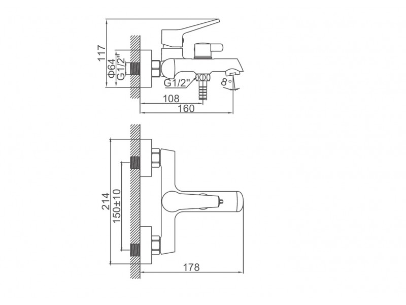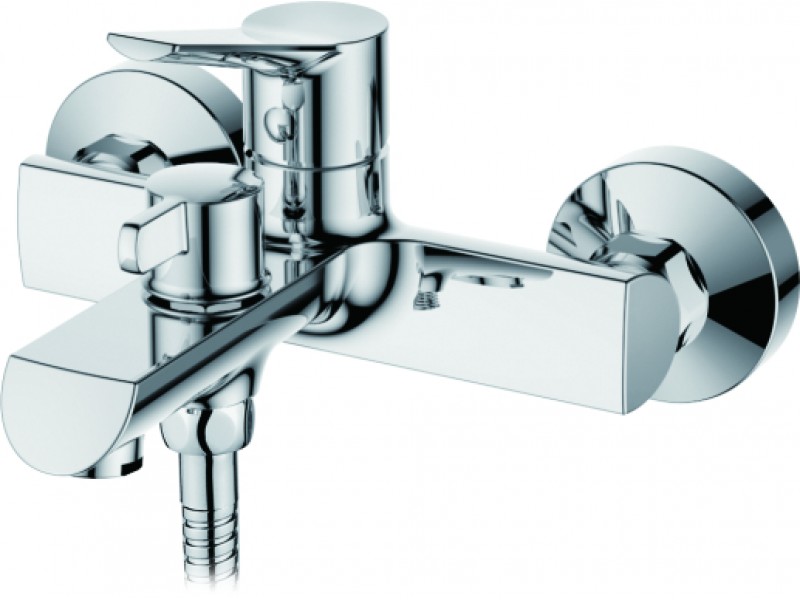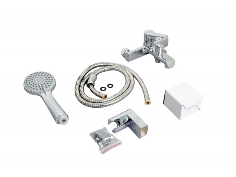 Комплект смесителя включает эксцентрики для крепления к системе водопровода с декоративными чашками (отражателями),шланг для душевой лейки,разборную лейку для душа l22,крепление душевой лейки l34.