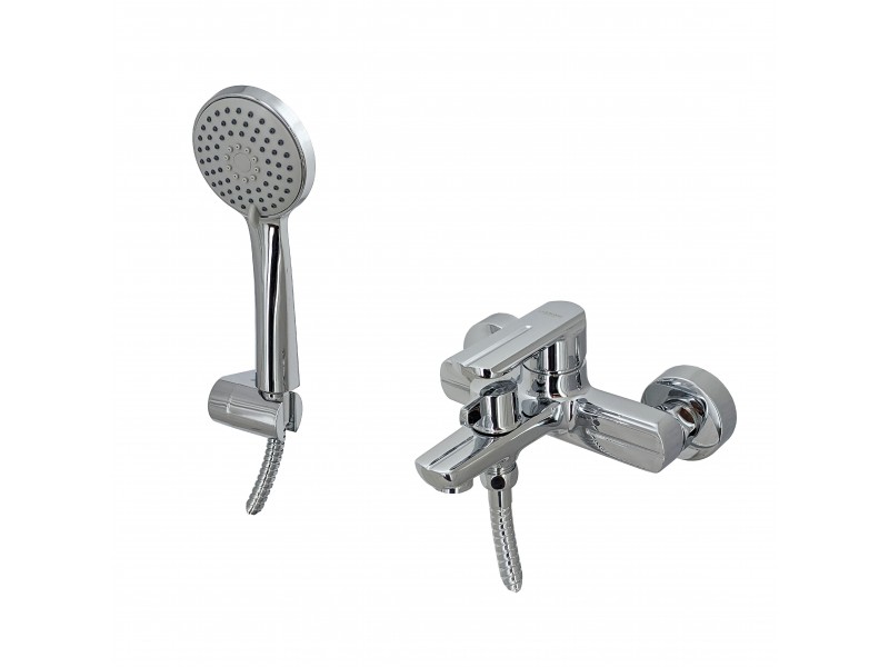 Комплект смесителя включает эксцентрики для подключения и душевую лейку со шлангом и креплением.