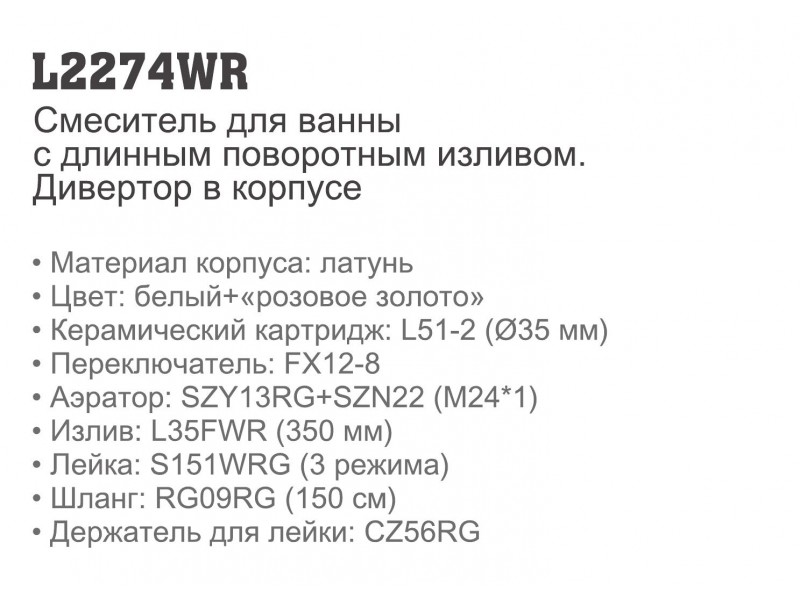 Модель для ванной с цельнолитым корпусом из латуни и перекидным изливом 35см L2274 укомплектована керамическим картриджем 35мм.