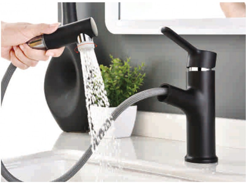 Смеситель для установки на умывальник с выжвижной лейкой. Может применяться как в парикмахерской так и в санузлах для личной гигиены. Ручная лейка выдвигается на расстояние до 90см.
