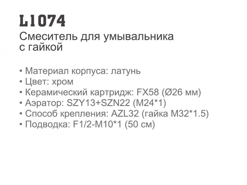 Модель для умывальника с цельнолитым корпусом из латуни L1074 укомплектована керамическим картриджем 35мм.