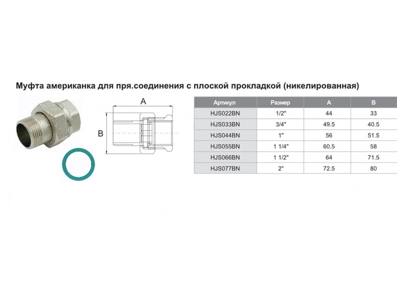 Муфта американка для прямого соединения с плоской прокладкой никелированная 1/2"г/ш TIM HJS022BN