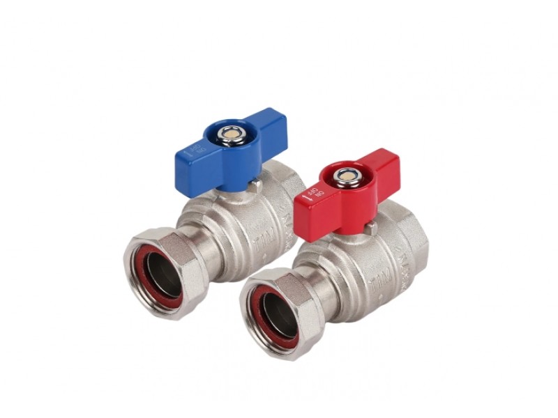 - Комплект поставки — два крана: один с красной ручкой, другой — с синей.