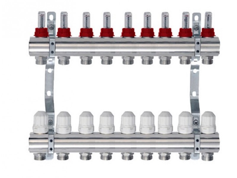 Коллекторная группа применяется для лучевых схем систем отопления с девяти контурами.Укомплектована расходомерами и термостатическими вентилями на обраном коллекторе.Крепиться кронштейном идущим в комплекте.Позволяет контролировать и регулировать напор отдельных контуров.Вносит минимальные потери напора в системе.Удобный и быстрый монтаж.