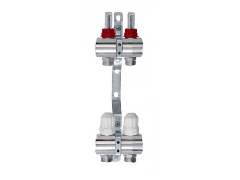 Коллекторная группа применяется для лучевых схем систем отопления с двумя контурами.Укомплектована расходомерами и термостатическими вентилями на обраном коллекторе.Крепиться кронштейном идущим в комплекте.Позволяет контролировать и регулировать напор отдельных контуров.Вносит минимальные потери напора в системе.Удобный и быстрый монтаж.