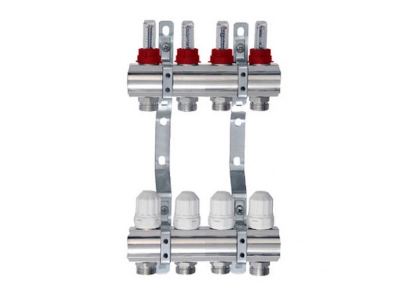 Коллекторная группа применяется для лучевых схем систем отопления с черырьмя контурами.Укомплектована расходомерами и термостатическими вентилями на обраном коллекторе.Крепиться кронштейном идущим в комплекте.Позволяет контролировать и регулировать напор отдельных контуров.Вносит минимальные потери напора в системе.Удобный и быстрый монтаж.