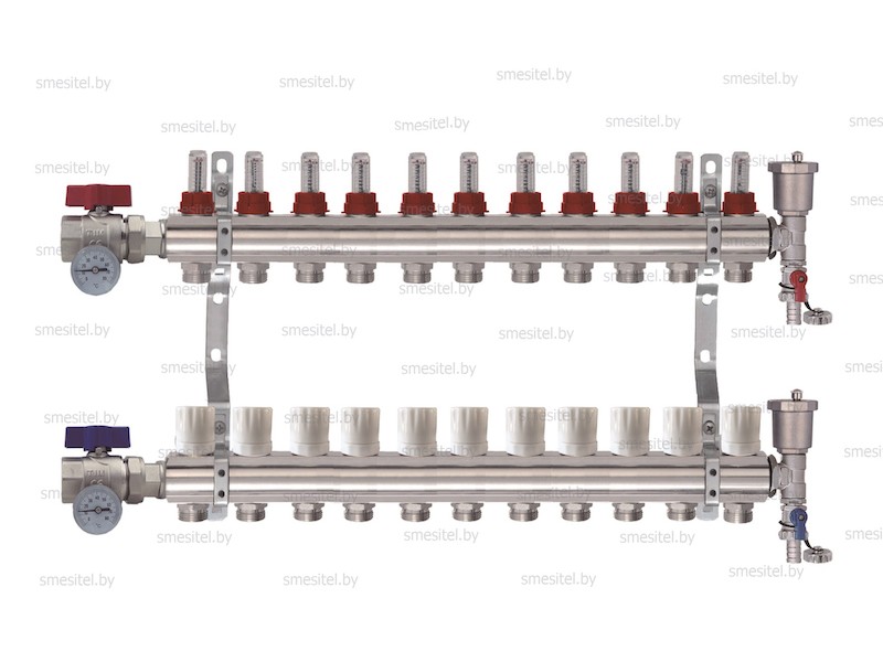 Коллекторная группа применяется для лучевых схем систем отопления с одиннацати контурами.Укомплектована расходомерами и термостатическими вентилями на обраном коллекторе.Крепиться кронштейном идущим в комплекте.Позволяет контролировать и регулировать напор отдельных контуров.Вносит минимальные потери напора в системе.Удобный и быстрый монтаж.
