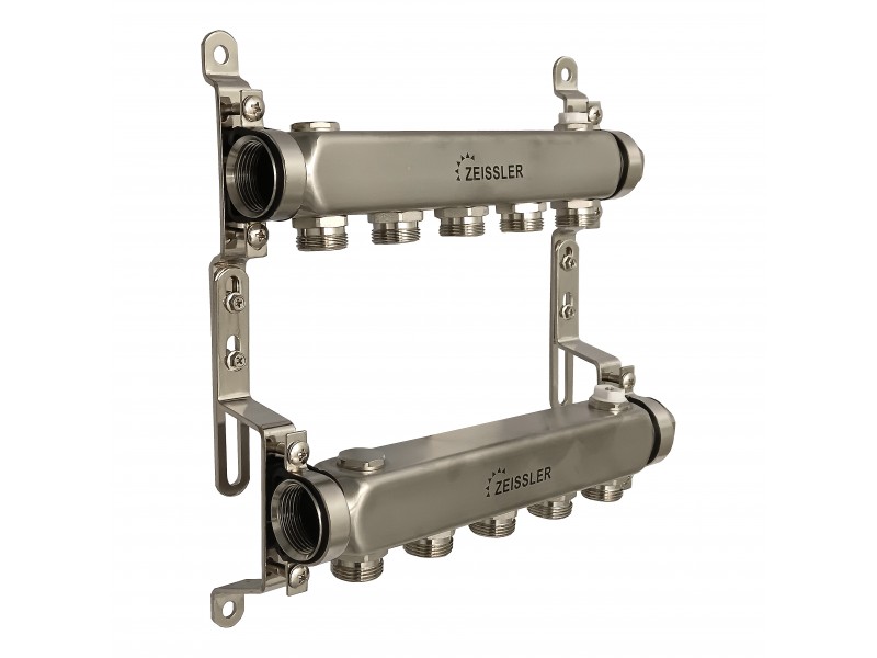 Коллектора из нержавеющей стали AISI 304 с увеличенным межосевым расстоянием 50 мм предназначены для групповой установки квартирных водосчетчиков или теплосчетчиков в этажных узлах учета многоквартирных зданий. По средствам этажных коллекторных узлов реализуют горизонтальную разводку системы отопления, которая позволяет осуществить индивидуальный учет воды и тепла.