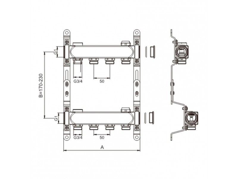 Выходы от 2 до 12 с соединением 3/4" Евроконус. Межосевое расстояние: 50мм.