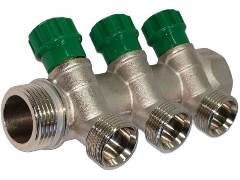 Латунный никелированный коллектор на 3 выхода диаметром 3/4" с наружной резьбой, стандарт присоединения - евроконус. На каждом выходе предусмотрен вентиль для регулирования расхода рабочей среды. Диаметр коллектора 1", резьба - внутренняя/наружная. Ремонтопригодный. Рабочая температура теплоносителя - до 110 °С, давление-до 10 бар. Применяется для распределения потоков жидкостей в контурах теплого пола, радиаторного отопления, холодного и горячего водоснабжения.