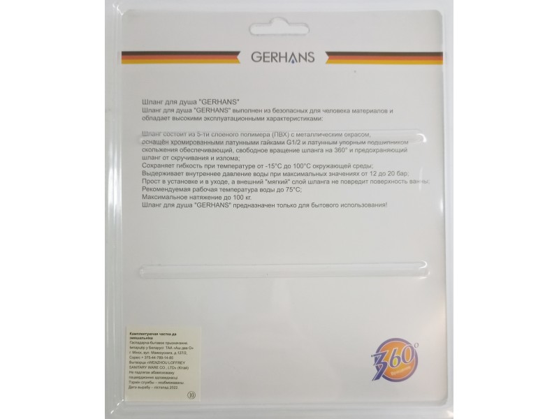 Шланг для душа PVC ПВХ GERHANS K40205-1.2 шланг имп/имп 1,2