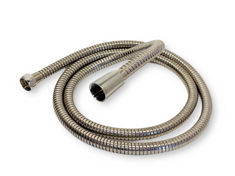 Шланг для душа со специальным штуцером защищающий от излома и с усиленным фитингом свободного вращения расстягивающийся, двойной замок оппетки,